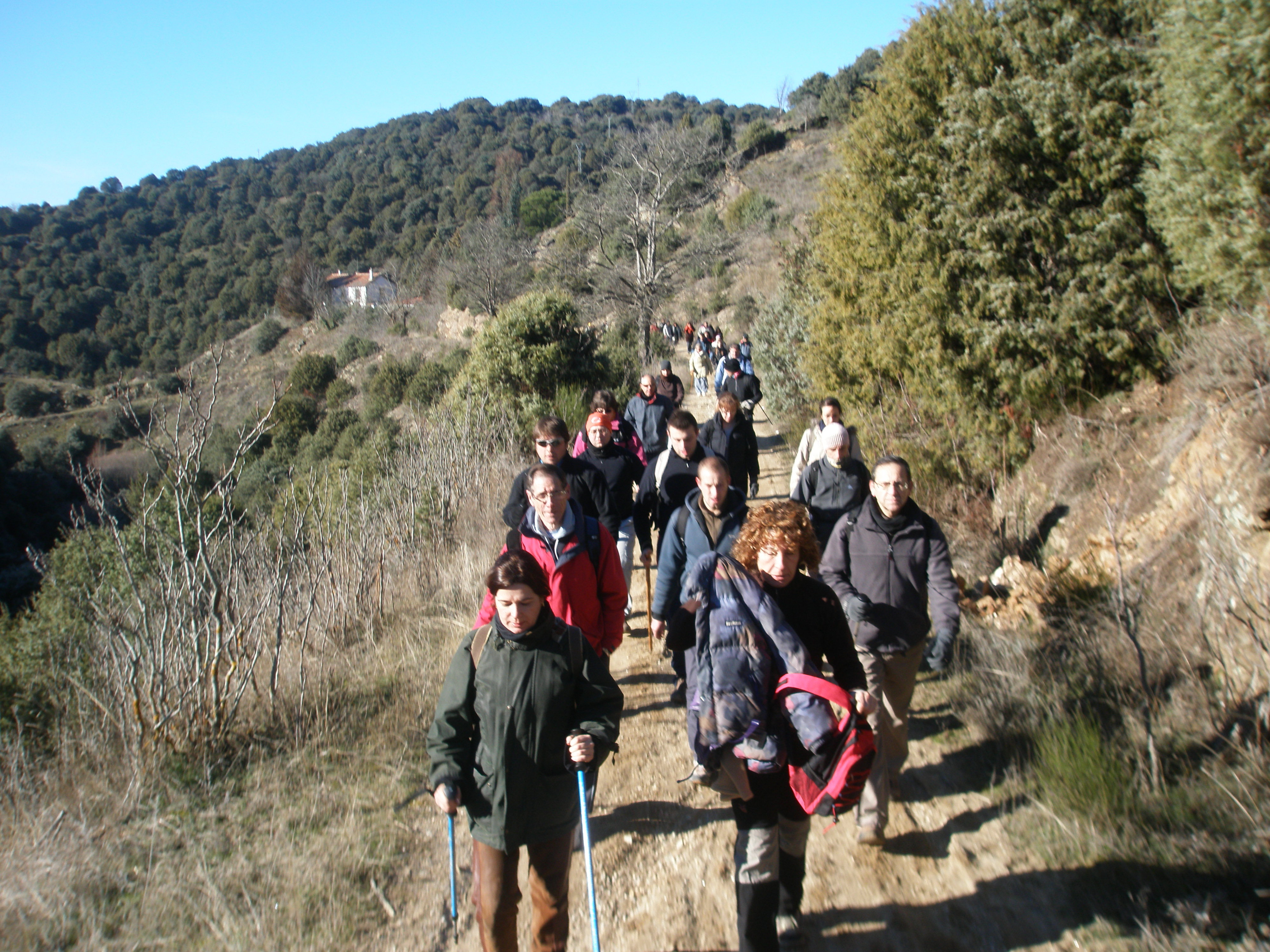 Hoy ha hecho un día estupendo en la tercera ruta. Amaneció con una temperatura inferior a tres grados bajo cero. Pero sabíamos que a medida que el sol saliese la mañana se iba a quedar esplendida. A mitad de camino hemos podido degustar un caldo calentito por cortesía de la Escuela de Hostelería del Ayuntamiento de Pedrezuela. Creo que los setenta senderistas hemos disfrutado de los paisajes por el cañón del río Guadalix.
