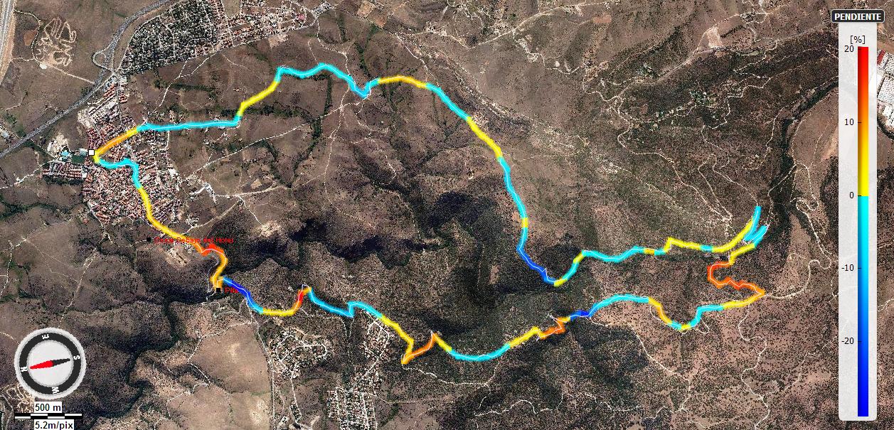 Este es el perfil de la 5ª ruta con los niveles de pendiente. En rojo los tramos con subida más dificiles y en azul los tramos «llanitos» y de bajada. Una ruta preciosa para disfrutar del final del invierno.